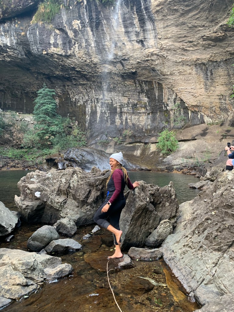 We arrived at the place on time and off we went, the trip was a 3–4-hour drive. Another great part about this trip was the fact that I was not driving. Anybody who knows me will tell you that I will do anything to get out of driving anywhere. I want to go places but can someone drive, please. Luckily, my friends know this and they are always happy to pick me up and they drive me to our adventures. Anyway, back to the trip, the road trip was amazing, we stopped halfway to get breakfast and coffee of course. No day starts without a cup of coffee for me. It was Friday morning when we left for Drakensburg, we arrived there within 4 hours, and immediately even before checking in, our tour guide told us we will be hiking about 15km at a place known as uThukela. Words cannot explain the beauty, tranquility that I experienced there on that hike. We even came across a Gorge/waterfall. You must know that when I see water, I am like a child impatiently waiting to open gifts on Christmas day. So, we spent a bit of time on this Gorge, the sound of water, I am telling you, you forget that there is another world outside such place. Remember I said it was so cold on the day, but that did not stop me to take out my shoes and dipping my feet in that Gorge. I thought to myself, I am here for it all, everyone looked at me like I’m crazy. My friend asked me “Moira are you insane” I said yes am going in. OMG, I yelled out every curse word I could think of. LOL. The water was so cold I cannot even begin to explain, but it was so satisfying. I knew right then that I am going to have a fabtastic weekend. We hiked through gorgeous forests, surrounded by mountains, far away from civilization. All I could hear were birds chirping, wind blowing, and it was so peaceful, I could hear myself think. The conversations in between were also amazing, we got along well with other people we had just met for the first time
