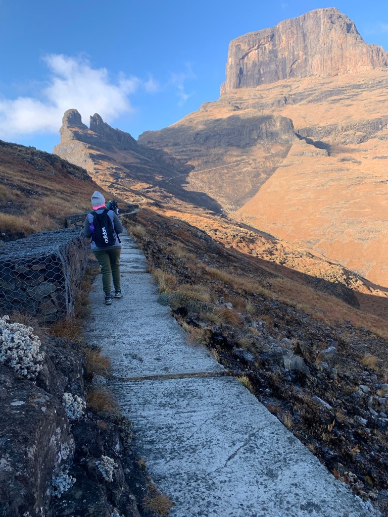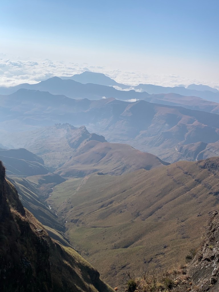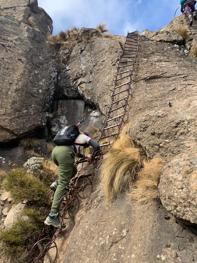 Day two came, we woke up bright and early for our next hike, this one was 23km long. When I heard this the night before that we will be hiking 23km, I thought to myself,” Moira what were you thinking.” We were going to hike in the Eastern Freestate, so it was a 1hr30 minutes’ drive, again I didn’t mind because I was not driving. We were going to the place called Sentinel Peak -Mont-aux-sources. We were going to end up on Tugela Falls (the second-highest waterfall in the world). The hike started very well, and I was blown away by the tremendous beauty I saw that day. When we were 8km into our hike, the tour guide told us for us to get to Tugela which is 3166m high, we will have to go up the chain ladders (I was thinking to myself, Moira you are afraid of heights, are you sure you going to do this. Well, we continued with our hike and we got to the ladders, at that time I was so nervous my hands were shaking. Before I tell you about what happened there, let me digress a bit and tell you a story about those ladders. I grew up not far from Sentinel Peak, I grew up being told by my grandmother, my mother that no one should ever go climb those chains because there is a huge snake with seven heads (LOL, I know right) that swallow’s people if they go up there. Apparently, it swallows people if they made it angry and the weather changes drastically, it becomes misty you cannot see a thing. So that’s the story I had in my head when I took this trip, even though now am an adult I know that was an old wive’s tale.