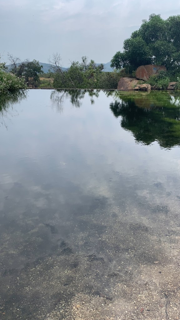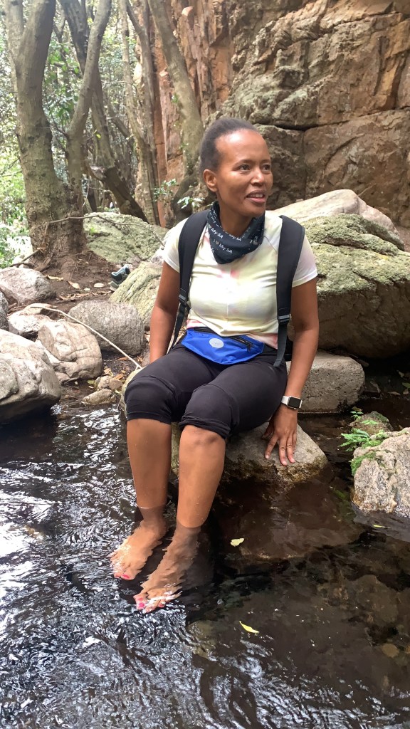 We were hiking at the place called Kranskloof, near Rustenburg. It’s a bit far from us but it was worth it. My friend Pumza always says, ” if you want to get to the wilderness, you need to be prepared to drive far out”. In this case, it was far out, almost two hours drive from where we live. I must say though, the drive was amazing, a lovely company in the car, beautiful scenery, mountains, farms, and mines. It was also drizzling at some point, and a rainbow came out after the drizzle, a very lovely thing to experience. After a long, beautiful drive we arrived at the place and immediately felt a sense of peace, fresh clean air, and therapy 101 began.