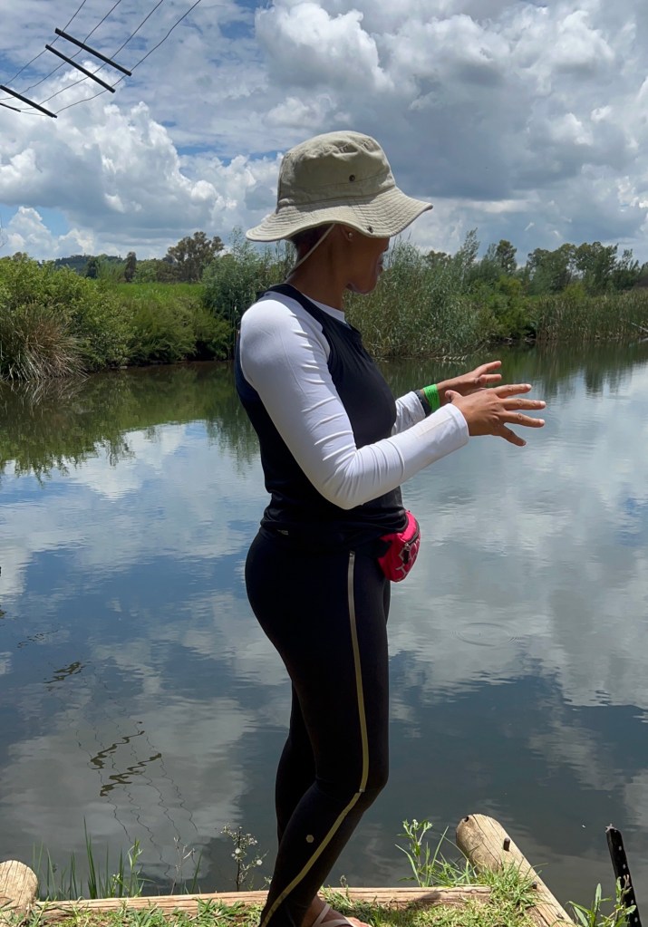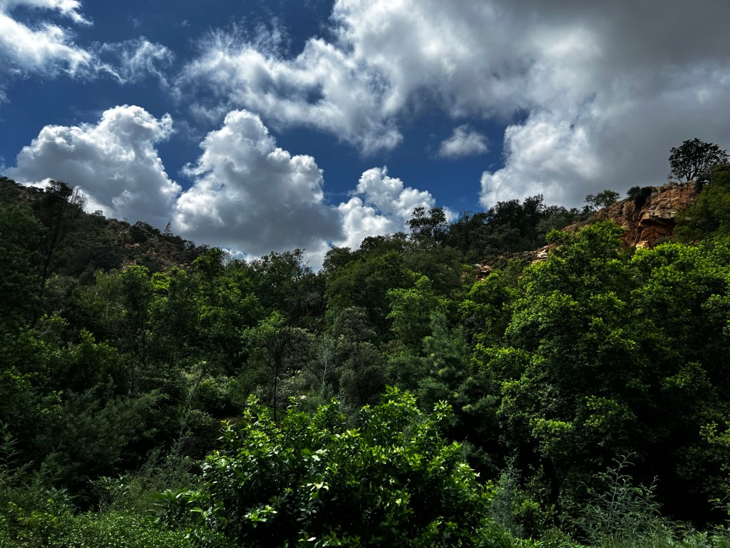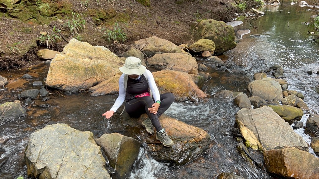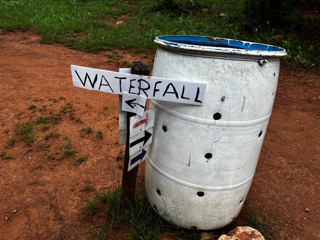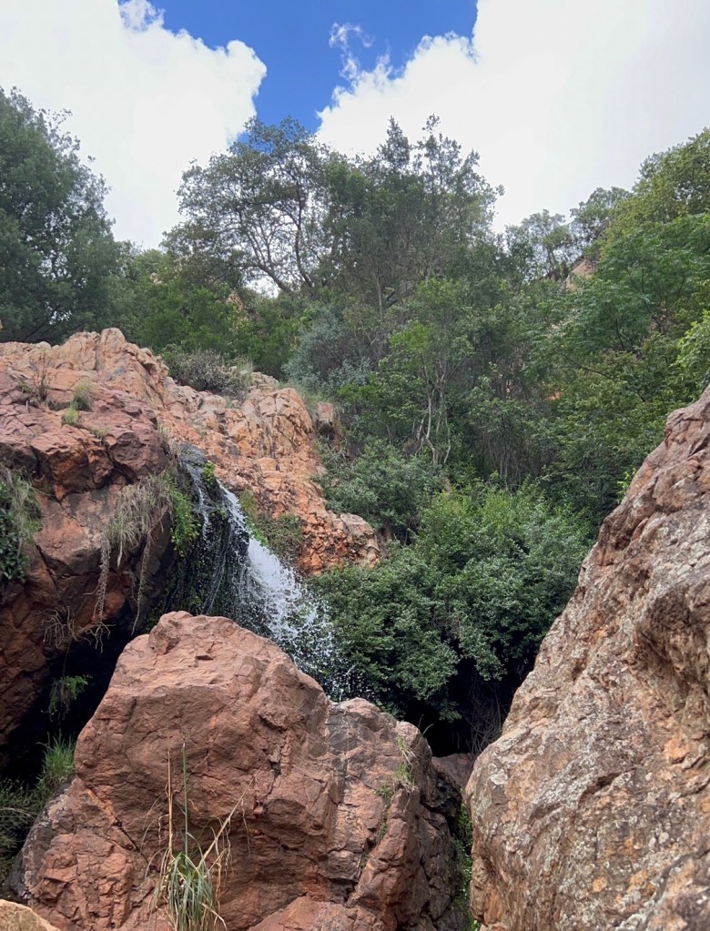 Kings Kloof immediately went straight to my top favourite hiking trails. It is close by, yet it feels like you have left Gauteng. We hiked 12km trail, easy and moderate. The property has multiple trail options, ranging from 6km to 21. I am looking forward to going back to hike 21km. I quicky forgot about the kind regards as soon as we started hiking. The air was cool and fresh, the ground a little damp, and the landscape… wow. The plants were so green and lush, it felt like I had walked into a different world. Every corner of the trail seemed like a new shade of green – it looked like someone sprayed the plants, they were so green and shiny. The whole experience was cinematic and had nice dramatic feel to it. But let’s talk about the trail’s real magic – the unexpected surprises. The first one that hit me was the gentle sound of water trickling in the distance. As we followed the trail, the sound grew louder, until we were greeted by a beautiful, serene stream weaving its way through the forest. We briefly quietly sat by the water stream and listened to the soothing sound of the stream. The water was crystal clear, gurgling over smooth rocks as if it was happily going about its business, unaware that it had just stolen the show. But the best surprise for me was A waterfall. Yes, a hidden gem tucked into the woods. It wasn’t one of those dramatic, roaring waterfalls but it was flowing so nicely, you could hear the sound coming around the corner.